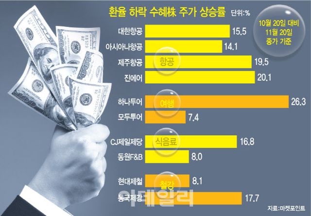 증권가에서도 환율과 유가가 동시에 하락하는 국면에선 주가 환율 하락 수혜를 받는 내수주가 두각을 나타낼 것으로 보고 있다. 이재선 현대차증권 연구원은 “이번 유가 하락과 원화 강세 조합은 수출주보다 내수주에 트레이딩(거래) 기회를 제공한다고 생각한다”며 “내수주 중에서는 비용 절감에 따른 영업이익률 추정치 반등이 나타나고 있는 항공, 음식료, 유틸리티 업종이 매력적일 것”이라고 분석했다.