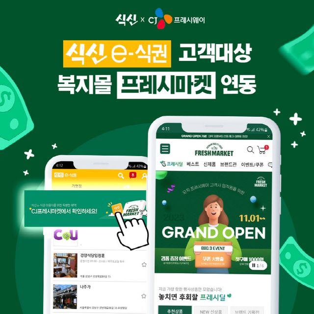식신은 이번 CJ프레시웨이와의 제휴를 통해 900개 고객사의 약 23만명의 사용자를 확보한 국내 최대 모바일 식권 서비스인 ‘식신e식권’ 고객들을 대상으로 프레시마켓을 이용할 수 있도록 제공키로 하고, 이달부터 서비스 연동을 시작했다.