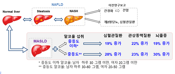 지난 19일 질병관리청 국립보건원 연구팀은 대사이상지방간 질환자에서 심혈관질환 발생위험을 분석한 결과, 지방간이 없는 사람들 대비 대사이상지방간질환이 있는 경우 심혈관질환 위험이 19% 증가했고, 중등도 알코올(남성 30-60g/day; 여성 20-40g/day)을 섭취해도 그 위험도가 28%까지 증가하는 것을 확인했다고 밝혔다. 이는 고위험음주에 의한 지방간질환(ALD) 환자에서의 29% 증가와 동일한 수준이다.