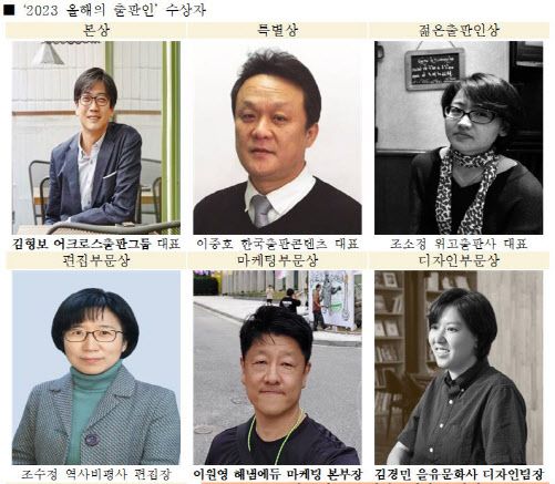 특별상은 이중호 한국출판콘텐츠 대표, 젊은출판인상은 조소정 위고출판사 대표에게 돌아갔다. 편집부문상은 조수정 역사비평사 편집장, 마케팅부문상은 이원영 해냄에듀 마케팅 본부장, 디자인부문상은 김경민 을유문화사 디자인팀장이 각각 받는다.