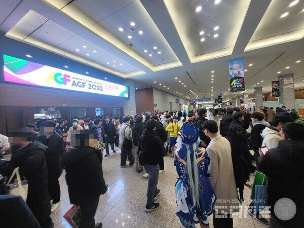이번 ‘AGF 2023’은 호요버스가 메인 스폰서를 맡은 것을 시작으로 작년 대비 2배 이상 커진 행사장 크기와 다양한 부스가 참전하면서 티켓 예매도 역대 최고치를 기록했다. 그러다보니 대기열이 제 1 전시장 내부를 시작으로 제 2 전시장까지 이어지는 믿을 수 없는 상황이 펼쳐졌다.