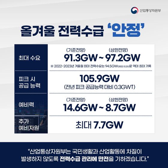 올해 겨울은 원전과 재생에너지 등 발전기의 꾸준한 증가에 따라 역대 최초로 전력수급 대책 기간 모든 주차에 100GW 이상의 공급능력이 확보됐다.