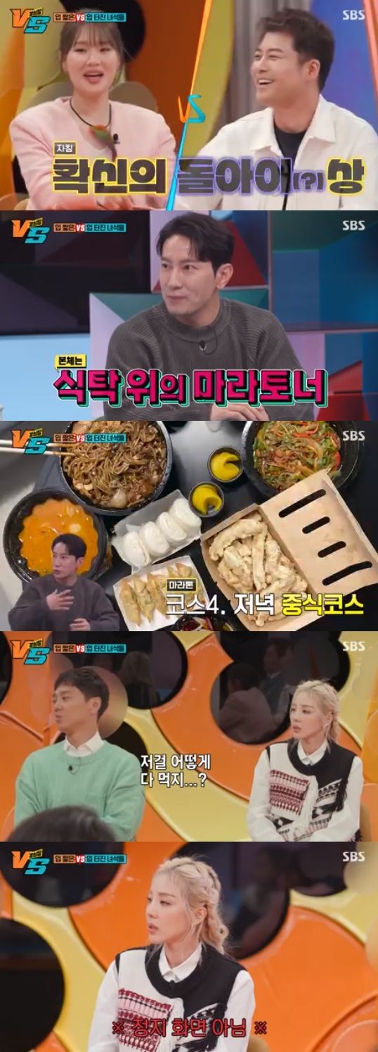 5일 방송된 SBS 새 예능 프로그램 '강심장 VS'에서는 먹기 위해 사는 '입 터진 녀석들' VS 살기 위해 먹는 '입 짧은 녀석들'이란 주제로 극과 극 취향 토크가 펼쳐쳤다. '입 터진 녀석들'에는 신기루, 이국주, 에이전트 H가 출연했고, '입 짧은 녀석들'에는 산다라박, 김두영이 출연해 이야기를 나눴다.