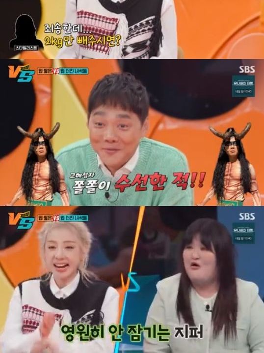전현무는 '입 짧은 녀석들'의 산다라박과 김두영을 바라보며 "두 분의 몸므게를 합쳐도 100kg이 안된다고 하더라"고 했고, 두 사람은 인정했다. 김두영은 "50kg대 후반"이라고 했고, 산다라박은 "요즘에 잘 먹어서 살이 쪘다. 현재 38kg"이라고 말해 모두를 놀라게 했다.