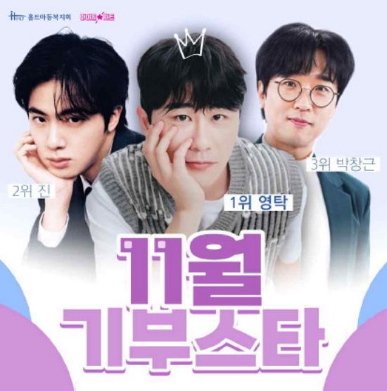 최근 홀트아동복지회(회장 신미숙)는 11월 아이돌차트 기부스타 1, 2, 3위인 영탁, 방탄소년단(BTS) 진, 박창근의 팬들이 위기가정아동을 위한 후원금을 전달했다고 밝혔다. 특히 영탁은 2021년 4월부터 31개월 동안 꾸준히 기부스타로 선정됐다.