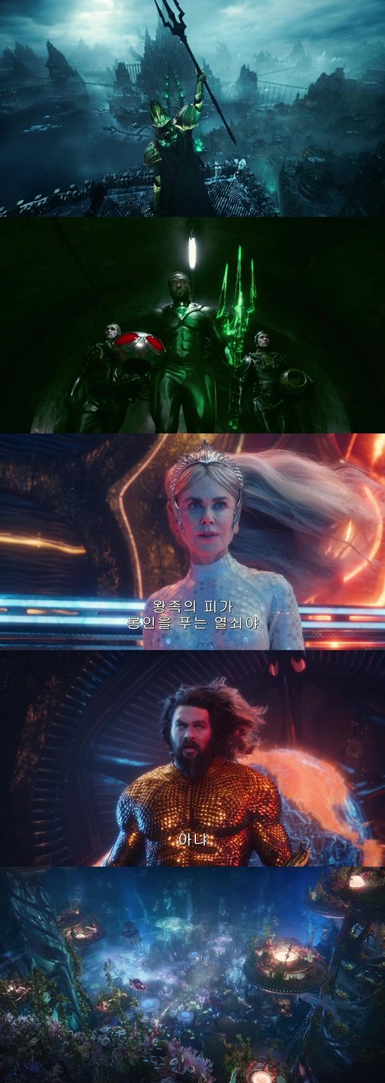 특히 엄청난 빙하 세계부터 여태껏 본 적 없는 화려한 심해 비주얼이 한시도 눈을 뗄 수 없게 만드는 가운데 멸망의 위기 속 전 세계를 지키기 위해 힘을 합치는 아틀라나 여왕(니콜 키드먼)과 옴(패트릭 윌슨)의 대단한 활약과 조화는 보는 이들의 궁금증을 드높인다.