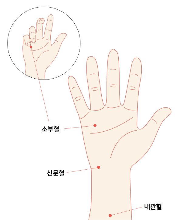 소부혈(주먹을 쥐었을 때 새끼손가락과 네 번째 손가락이 닿는 부분), 신문혈( 새끼손가락 쪽 손바닥과 손목의 경계주름 위에 위치. 손바닥을 위로 향했을 때 손바닥 쪽 뼈 아래 오목해지는 부분), 내관혈(손바닥과 손목의 경계 주름 가운데에서 팔 쪽으로 3cm 정도 아래 부분)을 5~10회 눌러준다.