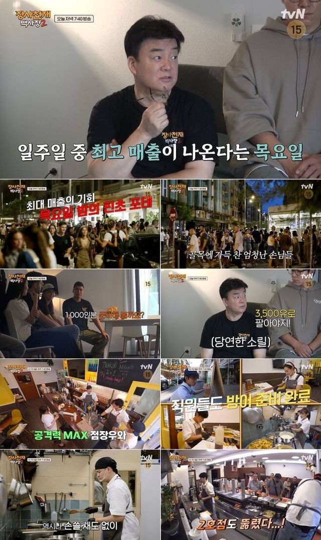 10일 오후 7시40분 방송될 tvN '장사천재 백사장2'에서는 스페인 산 세바스티안에서 최대 상권이 열리는 목요일 밤의 '핀초 포테'에 출사표를 던지는 모습이 그려진다.