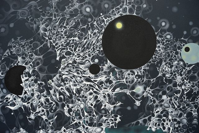 주로 바탕을 어둡게 칠하고 보색 계열의 반대되는 색으로 단편적인 이미지의 잔상들을 공간 속으로 흩어지게 하거나 환영처럼 제시하고자 합니다. 화면 안의 응축된 에너지 혹은 다른 차원으로 연결된 탈출구처럼 보이는 검은 원(처음 작업안에 등장했을 때는 부정적인 면을 강조하고자 했으나 더 이상 긍정도 부정도 아닌 근원적인 물음의 대상)을 중심으로 매일 같이 해체돼 어둠속으로 사라지는 불완전한 세계를 지탱할 골격을 만들고자 합니다.