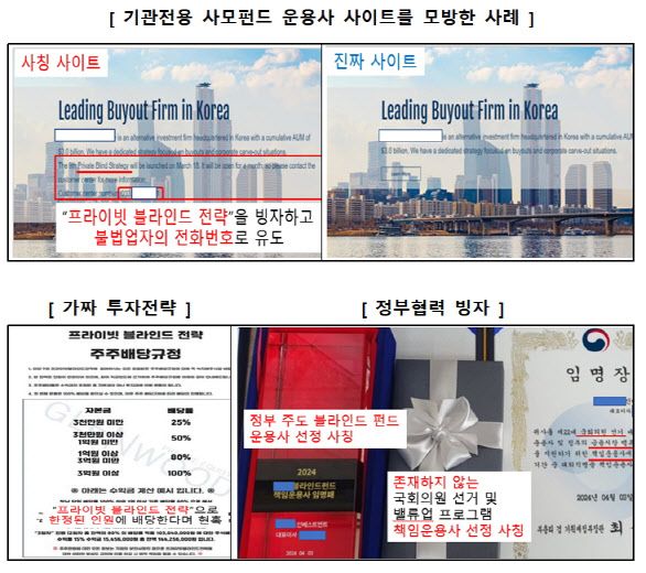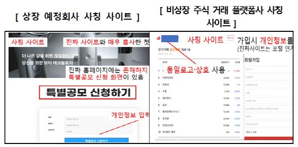 금융감독원은 22일 최근 사모펀드 운용사, 상장 예정 회사 등을 사칭해 가짜(피싱) 사이트로 투자자를 유인한 후 자금을 편취하는 불법업자가 성행하고 있다면서 이같은 입장을 밝혔다. 적발 내역에 따르면 증권사 등 제도권 금융사를 사칭했던 그간 수법과 달리, 최근에는 일반인이 알기 어려운 ‘기관전용 사모펀드 운용사’를 사칭하거나 IPO 관련 ‘상장 예정회사’ 및 ‘비상장 주식 거래 플랫폼사’를 사칭하는 가짜 홈페이지 사용 수법이 등장했다.