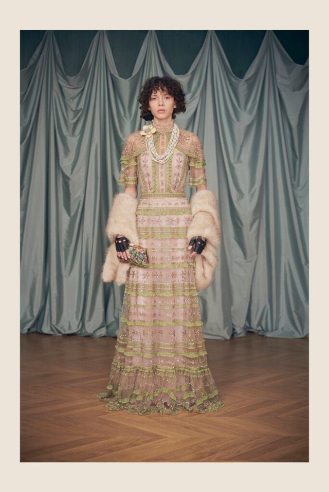 미켈레는 이번 컬렉션을 통해 무려 171개의 룩을 선보였습니다. 미켈레 특유의 젠더 플루이드한 접근과 발렌티노 창립자 가라바니의 우아한 스타일이 절묘하게 어우러졌죠. 레이어드 진주 목걸이, 오버사이즈 퍼 커프, 푸시보우 블라우스 등을 통해 로맨틱함을 한껏 끌어 올렸고, 발렌티노를 상징하는 레드 컬러와 ‘V’ 로고, 하운드 투스 패턴 등도 섬세하게 활용했습니다.