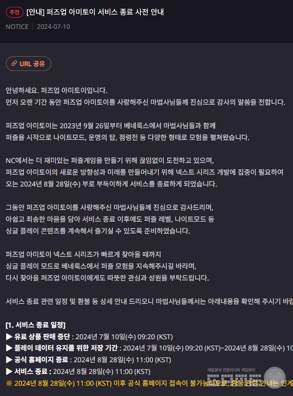 엔씨는 10일 퍼즈업 아미토이 공식 페이지를 통해 서비스 종료 소식을 알렸다.