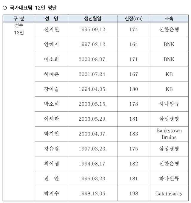 이번 대표팀 명단에는 두 해외파 박지수와 박지현을 포함해 신지현, 최이샘(이상 신한은행) 안혜지, 이소희(이상 BNK) 허예은, 강이슬(이상 KB) 박소희, 진안(이상 하나원큐) 이해란, 강유림(이상 삼성생명)이 포함됐다.