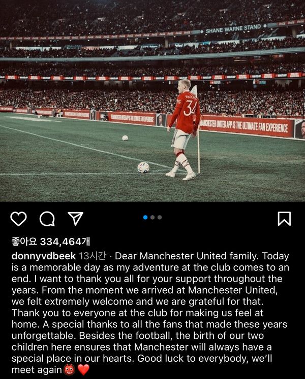 10일(한국시간) 판더베이크는 자신의 소셜미디어(SNS)를 통해 “오늘은 잊지 못할 날이다. 맨유에서 여정을 끝마치는 날”이라며 팬들에게 작별 편지를 남겼다.