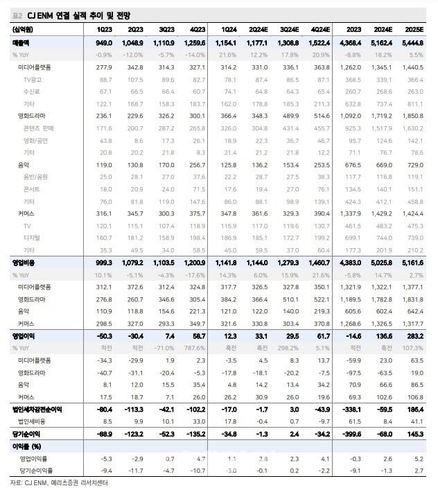 올해 연간 기준 매출액은 전년 대비 17.6% 증가한 5조1379억원, 영업이익은 1418억원으로 전년 대비 흑자전환할 것으로 봤다. 하반기에는 티빙 가격 인상 효과, 피프스시즌 작품 공급 확대, 제로베이스원 월드투어 등을 호재 요인으로 꼽았다.