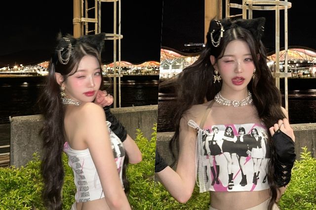 공연 차 홍콩을 찾은 장원영은 아이브 멤버들의 모습이 담긴 탱크톱 의상을 입고 홍콩 야경을 배경으로 사진을 찍고 있다. 특히 머리에 검은 고양이 귀 장식을 단 장원영은 요염한 자태로 감탄을 자아냈다.