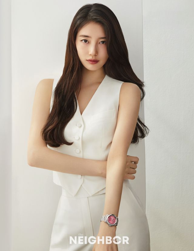 론진의 엘레강스 앰배서더 수지. 핑크 다이얼 콘퀘스트 34mm 모델을 착용했다.