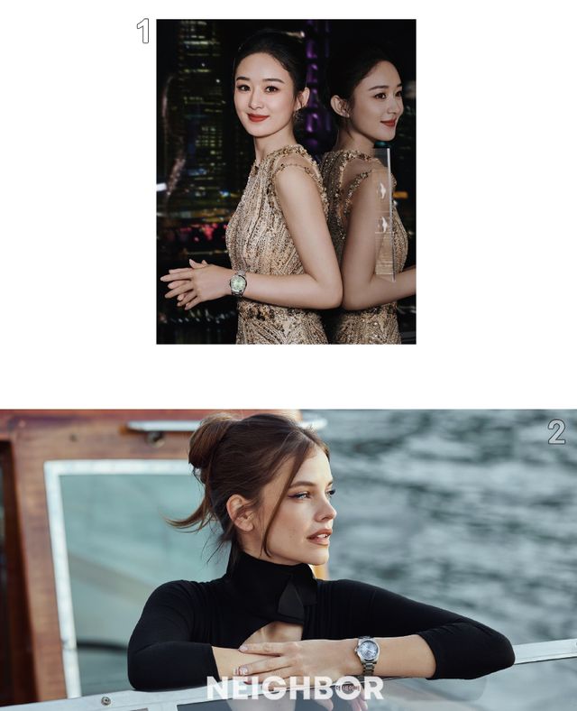 1 그린 다이얼 콘퀘스트 34mm 모델을 착용한 중국 배우 조려영. 2 헝가리 출신 모델 겸 배우인 바바라 팔빈의 블루 다이얼 콘퀘스트 34mm 모델.
