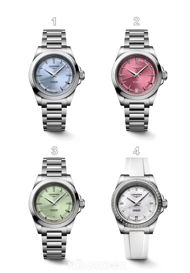 그린, 핑크, 블루 다이얼로 출시된 2024 론진 콘퀘스트 34mm 쓰리 핸즈 모델은 수지, 바바라 팔빈, 조려영과 함께한 론진 캠페인에서도 드러나듯 낮과 밤, 운동화와 구두, 어떤 것이든 상관없이 모든 스타일과 환경, 활동에 잘 어울린다. 외부 스네일링 처리를 통해 우아하고 절제된 다이얼의 컬러는 더욱 선명하고 강렬하며, 11개의 실버 아워 마커와 6시 방향의 날짜창을 갖추고 있다. 폴리싱 처리된 로듐 도금의 아워 및 미닛 핸즈와 마찬가지로 3시, 9시, 12시 방향의 아워 마커는 슈퍼-루미노바Ⓡ로 코팅되어 낮과 밤 언제나 최적의 가독성을 선사한다. 34mm 버전은 다이아몬드를 장식한 또는 장식하지 않은 스틸 케이스, 로즈 골드 크라운과 로즈 골드 캡이 베젤에 장식된 이중 소재 케이스로 제공되며 다양한 컬러로 출시된다. 편안하고 어디에나 어울리는 이 워치는 삼중 안전 폴딩 버클이 장착된 스테인리스스틸 브레이슬릿 또는 미세 조정이 가능한 이중 안전 폴딩 버클이 장착된 아워글라스 모티프의 컬러 러버 스트랩과 함께 선보인다.