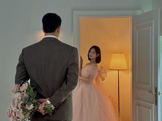 공개된 사진 속 김소희는 단발머리를 하고 핑크빛 쉬폰 웨딩 드레스를 입은 모습이다. 넓은 어깨를 자랑하는 예비남편이 꽃을 들고 김소희를 바라보고 있다.
