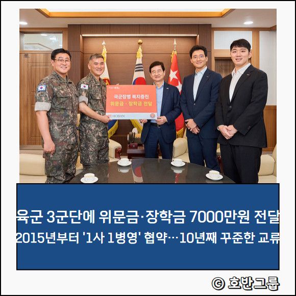 호반그룹은 3군단과 '1사 1병영' 협약을 맺고 10년간 꾸준한 교류를 이어가고 있다. 이번 위문금은 부대 발전과 군장병 사기 진작을 위해 사용될 예정이다.