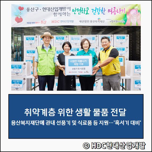 HDC현대산업개발(294870·이하 HDC현산)이 용산구 취약계층 어르신의 혹서기 여름철 건강을 위한 식료품과 냉방 용품을 용산복지재단에 기부했다.