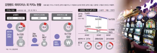 23일 업계에 따르면 파라다이스그룹은 지난해 방문객수 85만명에도 불구하고 드롭액(칩 구매 총액) 6조1732억원을 달성한 반면, 강원랜드는 파라다이스그룹보다 3배가량 많은 241만명의 방문객수에도 드롭액은 5조7220억원에 그쳤다. 강원랜드가 국내 유일한 내국인 전용 카지노라는 유리한 위치에서도 뒤처지고 있다는 평가가 나오는 이유다.
