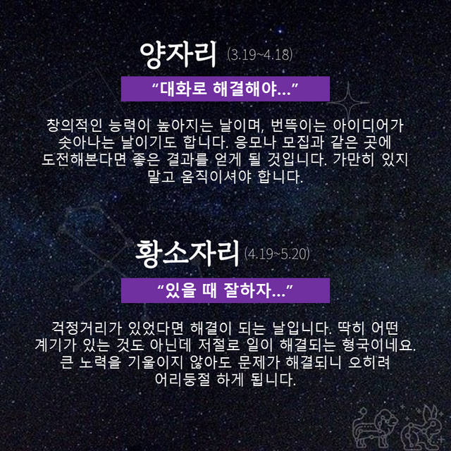 커플인 분의 경우 아무런 문제가 없는데도 괜스레 멀게 느껴질 수 있습니다. 쓸데없는 농담보다는 진지한 대화가 두 사람 사이를 묶어줄 것입니다. 싱글인 분의 경우에는 자신과 어느 정도 나이차가 있는 상대를 골라보면 좋겠네요.