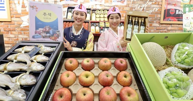 지난달 29일 오전 서울 이마트 용산점에서 모델들이 추석 선물 세트를 선보이고 있다. 이마트는 2일부터 다음 달 6일까지 추석 선물 세트 사전 예약을 받는다. 행사 카드로 구매하면 최대 50% 할인, 구매 금액대별로 최대 120만 원의 신세계상품권을 증정한다. / 연합뉴스