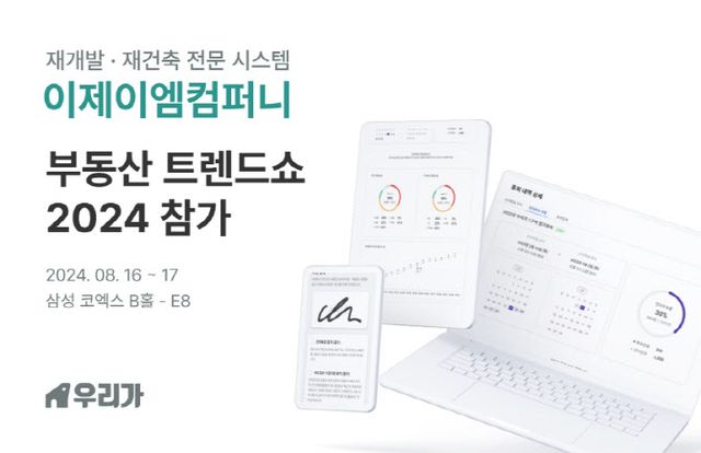 윤의진 이제이엠컴퍼니 대표는 “이번 트렌드쇼를 통해 ‘우리가’의 혁신적인 솔루션을 소개하고, 디지털 전환을 통한 재개발·재건축 등 도시정비시장의 미래 모델을 제시할 것”이라며 “우리의 목표는 도시정비사업을 더 효율적이고 투명하게 만들어, 모든 이해관계자들에게 혜택이 돌아가도록 하는 것”이라고 전했다.