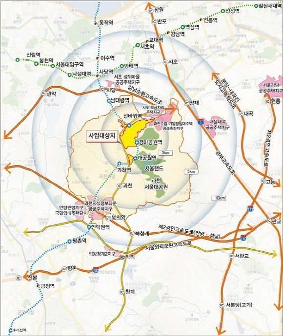 '교통 요지' 과천 지구는 4호선(선바위역 등)을 통해 강남역까지 20분 내 이동 가능하며, 과천봉담도시고속화도로·경부고속도로(양재IC) 등 도로교통 인프라도 우수하다. 아울러 사업지구 옆에는 서울대공원·국립현대미술관·국립과천과학관 등이 위치하며, 주변에는 관악산·청계산·우면산이 마주하고, 양재천·막계천 등이 흐르는 등 자연환경도 매우 뛰어나다.