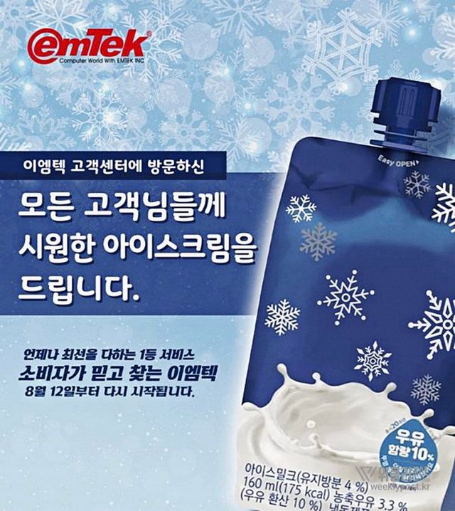 토종 그래픽카드 브랜드 이엠텍아이엔씨가 자사 고객지원센터 방문 고객을 대상으로 아이스크림을 무상 지급을 밝혔다. 지난 2011년 여름부터 시작된 아이스크림 제공 행사는 올해로 13년째 이어지게됐다. 코로나바이러스 감염증(2020년~2022년) 시기를 제외하고 매년 준비했다.