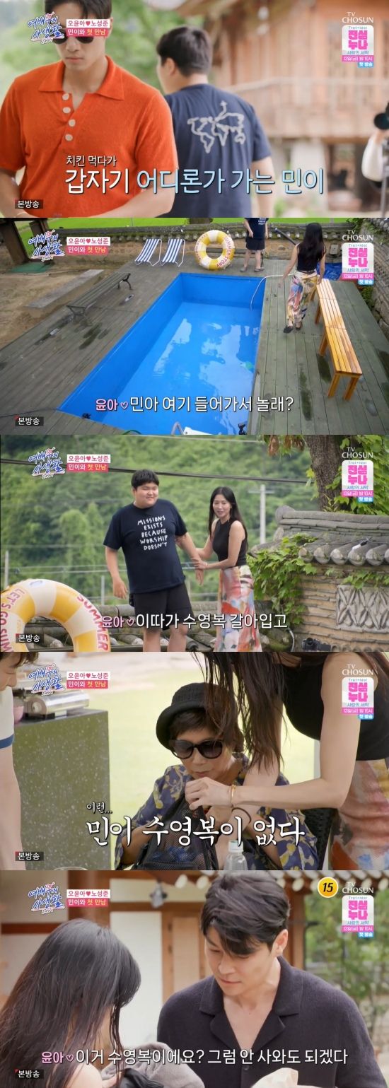 이에 노성준은 어디론가 향했고, 민이를 위해 자신의 수영복과 티셔츠를 오윤아에게 건넸다. 수영복을 갈아입고 나온 민이는 자연스럽게 노성준과 어깨동무를 하며 신발을 신었고, 수영장을 향하는 길에도 손을 꼭 잡고 이동했다.
