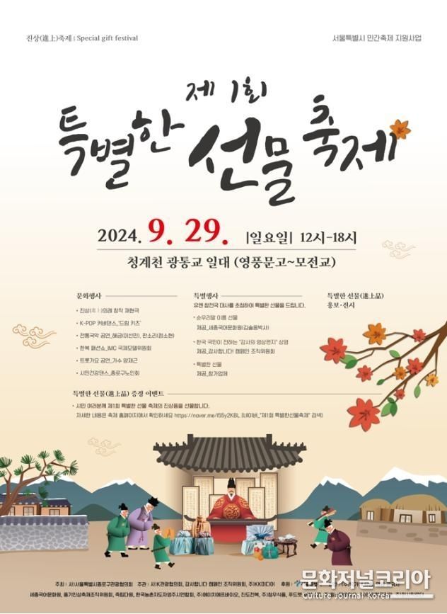 문화저널코리아 김영일 기자 | 사단법인 서울특별시종로구관광협의회는 9월 29일(일) 청계천 차 없는 거리에서 서울특별시 민간축제 지원 사업으로 ‘제1회 특별한 선물 축제’를 개최한다.