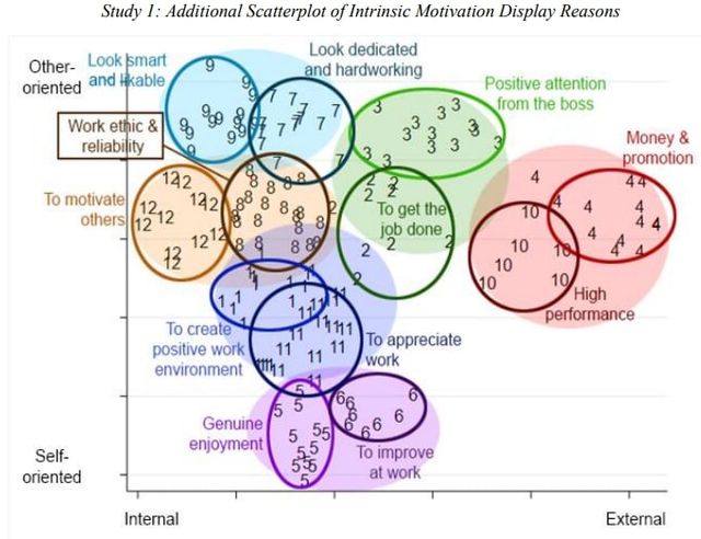 자신의 일을 더 사랑하는 사람들은 자신과 같이 일을 사랑하는 사람들에겐 도움의 손길을 내밀었지만, 외적 동기에 따라 일을 하는 동료들을 돕는 행동은 주저하거나 심지어 자신이 주도하는 중요한 프로젝트에서 배제시키고 무시하는 일도 나타났다.