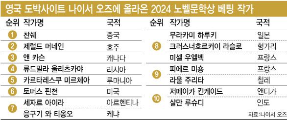 찬쉐를 비롯해 호주 제럴드 머네인, 캐나다 시인 앤 카슨, 러시아의 류드밀라 울리츠카야 등이 상위권에 포진했다. 배당률이 낮을수록 수상을 점치는 이들이 많다는 의미다.