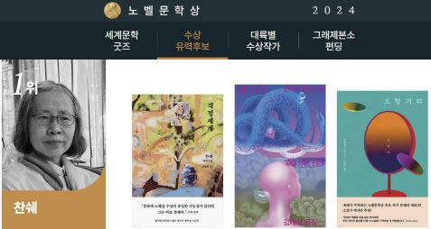 현재 나이서오즈(Nicer Odds) 베팅 1위는 중국의 찬쉐다. 찬쉐는 노벨문학상 유력 후보로 자주 거론됐던 인물이다. 대표작 ‘오향거리’(문학동네), ‘황니가’(열린책들), ‘격정세계’(은행나무) 등이 국내에도 소개됐다. 수상 시 모옌(2012)에 이은 두 번째 중국의 노벨문학상 수상 작가가 된다.