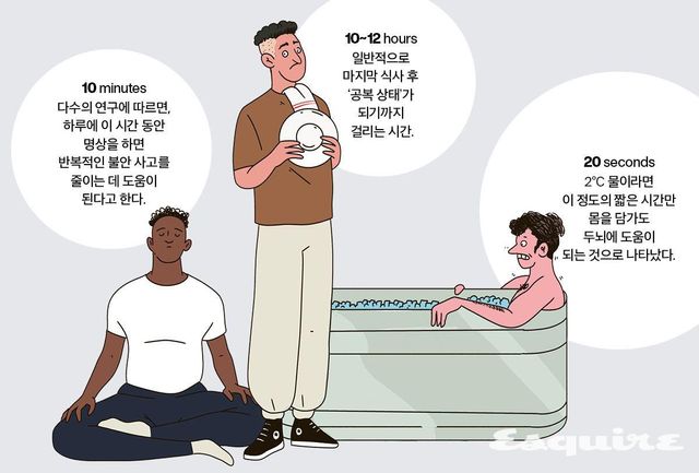 “온도가 낮을수록 물 안에 몸을 담그는 시간이 짧아져야 한다”는 게 신경과학자이며 런던의 스파 겸 헬스클럽인 사우나 앤 플런지(Sauna & Plunge) 소속 전문가 라나 파워(Lana Power)의 설명이다. “14°C의 물에서 최대 1시간 후까지 효과가 확인된다는 연구 결과들이 있어요. 2°C의 물에서는 20초만 있어도 신경전달물질 방출이 증가하는 것으로 나타났죠.”