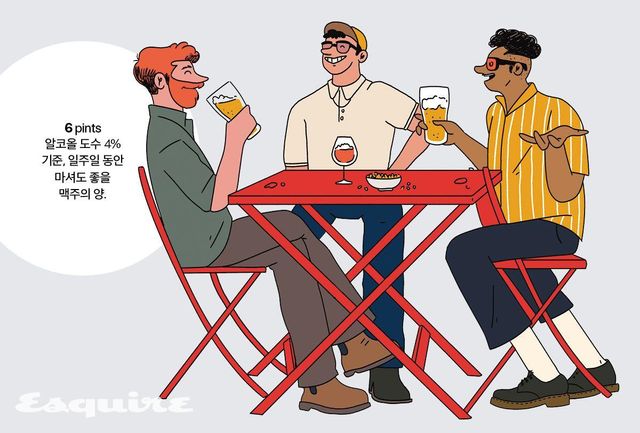 알코올 섭취로 인한 위험을 최소화하는 데 정말 관심이 있다면 NHS(영국 국민보건서비스) 가이드라인을 참고해보자. NHS는 일주일에 3일 혹은 그 이상에 걸쳐 섭취하는 순수 알코올 양이 14유닛(1유닛=10ml), 즉 140ml를 넘기지 않을 것을 제시한다. 알코올 도수 4%짜리 맥주 6잔(파인트 473ml 기준, 즉 총 2838ml)을 약간 상회하는 양이다. 신경정신약리학자이자 책 〈음주? 알코올과 건강에 대한 새로운 과학(Drink? The New Science of Alcohol and Health)〉의 저자인 데이비드 너트(David Nutt)는 “1주일에 14~28유닛(140~280ml)을 마시면 위험성이 심각하게 증가한다”고 말한다. “하지만 솔직히, 그 정도는 터무니없는 수준은 아니죠.” 그 이상이 될 때 곤혹스러운 상황이 벌어진다. 일주일에 50유닛(20~25파인트 잔) 이상 마시는 사람은 알코올 관련 손상을 입을 위험이 높은 것으로 간주된다. 너트 교수의 설명에 따르면 평소 주량이 많을수록 음주를 줄일 때 얻는 효과가 더 커진다.