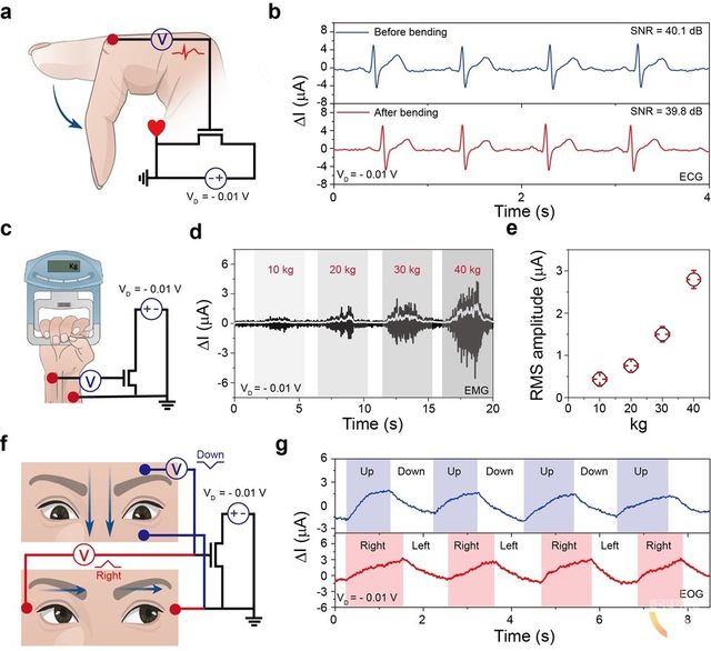 연구팀은 개발한 수직 구조의 유기 전기화학 트랜지스터를 1마이크로미터(μm) 두께의 고분자 기반 기판 위에 구현, 머리카락 두께의 100분의 1 수준인 총 두께 2마이크로미터의 초박형 센서를 제작했다. 해당 센서는 33% 압축 변형과 1000회 이상의 반복적인 인장 시험에서도 성능 저하 없이 안정적인 작동을 보였다. 다양한 움직임 속에서도 신뢰성 높은 생체신호를 측정할 수 있음을 입증한 것.