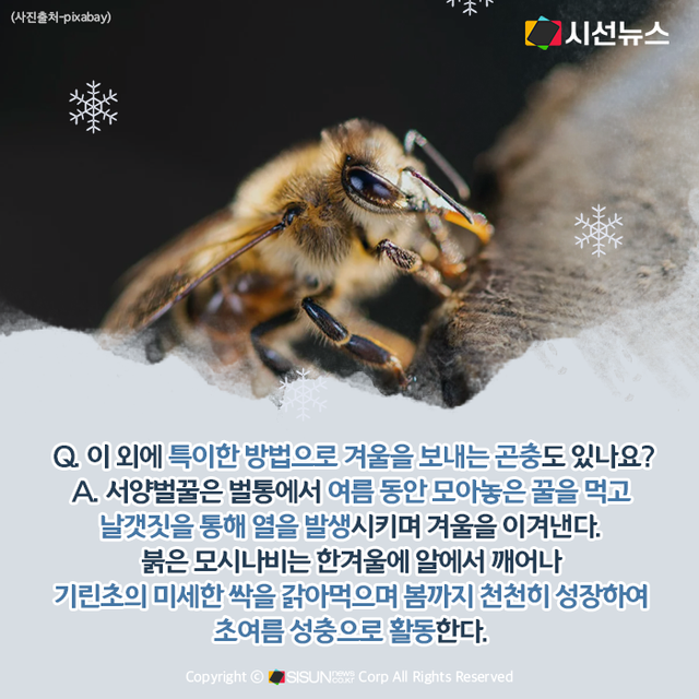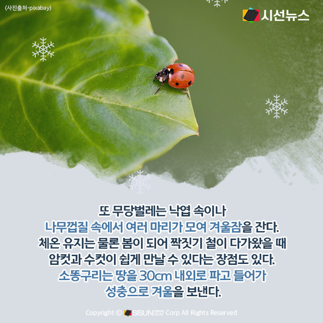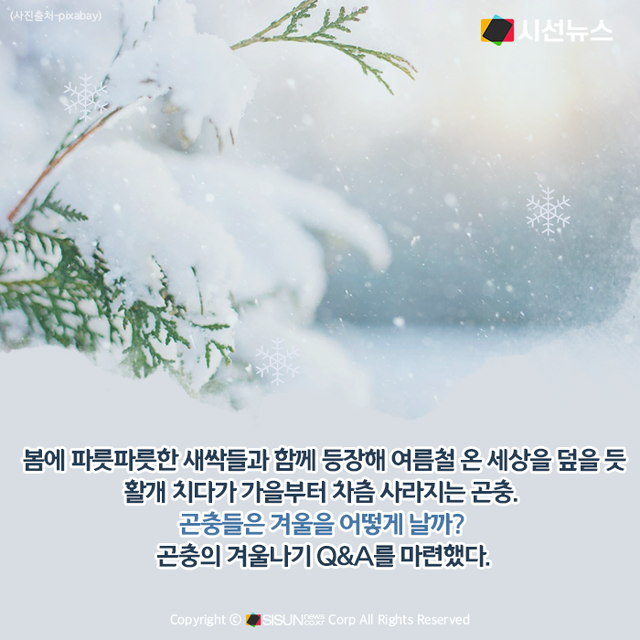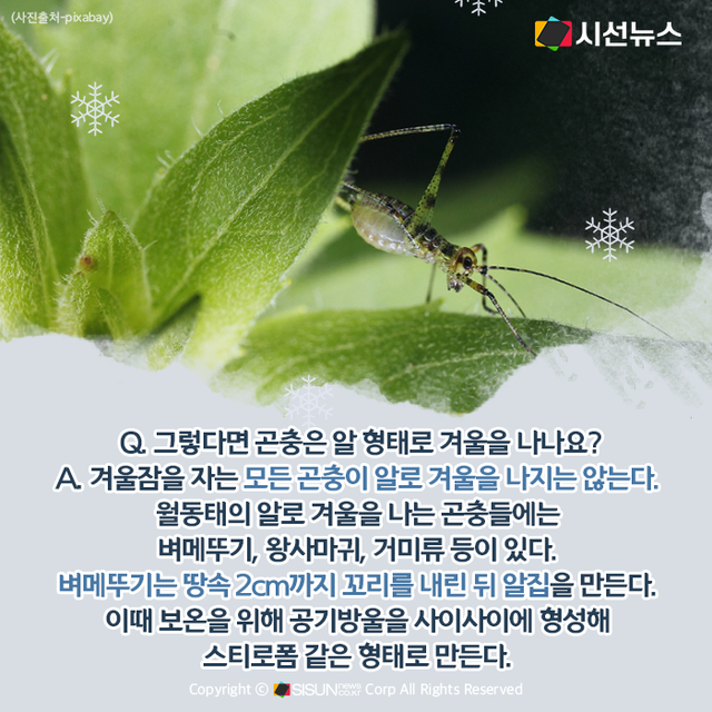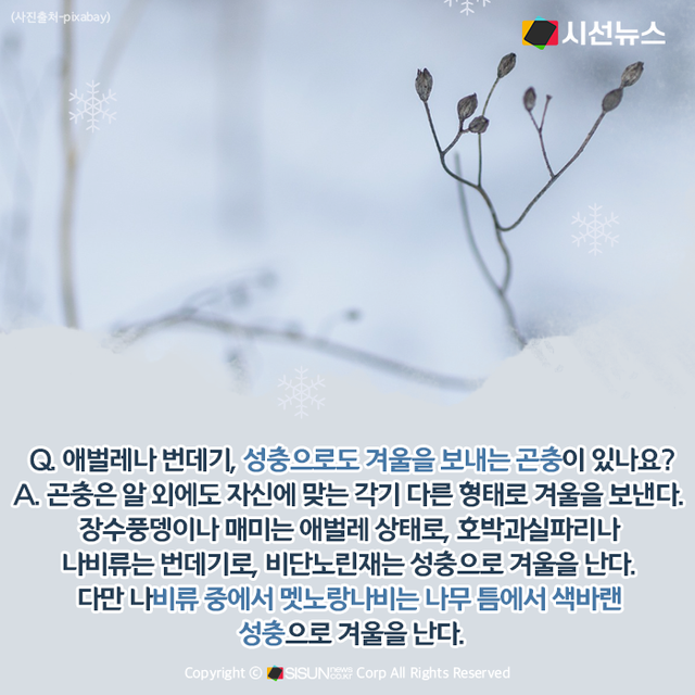 시선뉴스=양원민 기자ㅣ봄에 파릇파릇한 새싹들과 함께 등장해 여름철 온 세상을 덮을 듯이 활개 치다가 가을부터 차츰 사라지는 곤충. 곤충들은 겨울을 어떻게 날까? 곤충의 겨울나기 Q&A를 마련했다.