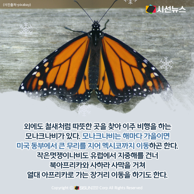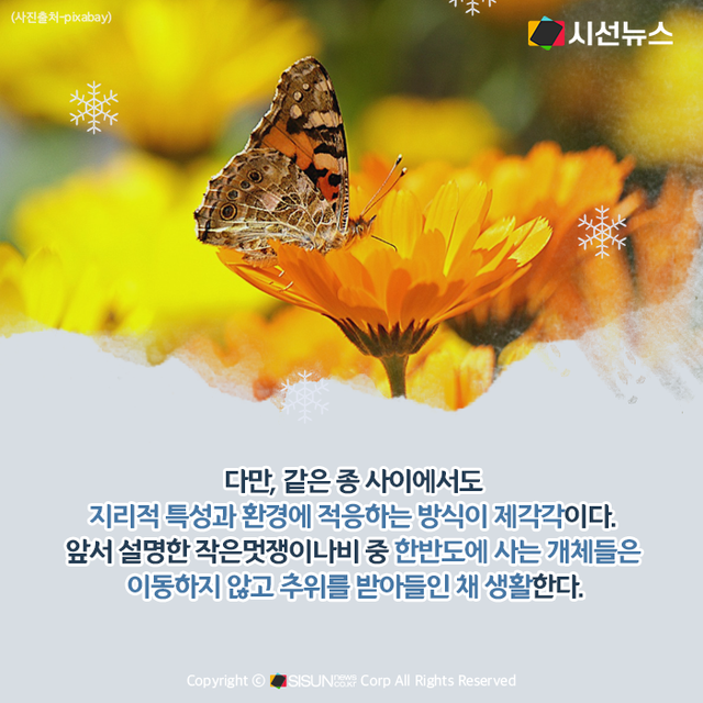 다만, 같은 종 사이에서도 지리적 특성과 환경에 적응하는 방식이 제각각이다. 앞서 설명한 작은멋쟁이나비 중 한반도에 사는 개체들은 이동하지 않고 추위를 받아들인 채 생활한다.