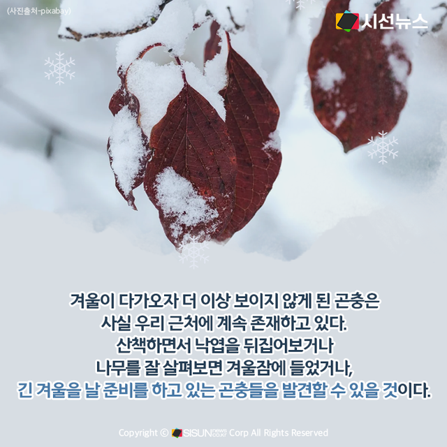 겨울이 다가오자 더 이상 보이지 않게 된 곤충은 사실 우리 근처에 계속 존재하고 있다. 산책하면서 낙엽을 뒤집어보거나 나무를 잘 살펴보면 겨울잠에 들었거나, 긴 겨울을 날 준비를 하고 있는 곤충들을 발견할 수 있을 것이다.