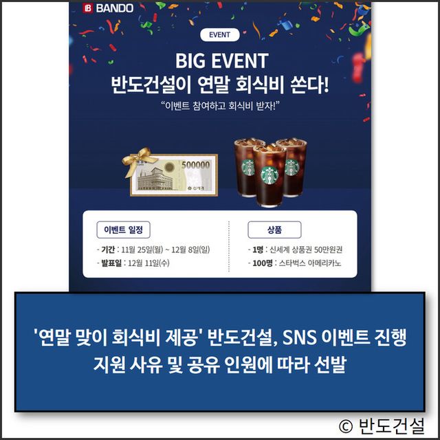 반도건설은 다음달 8일까지 연말 회식비를 경품으로 제공하는 댓글 이벤트를 진행 중이다. 이번 이벤트는 송년회가 많은 연말, 동료, 동호회, 친구, 가족들이 소통하며 즐거운 시간을 보낼 수 있는 기회 마련을 돕기 위해 준비했다.