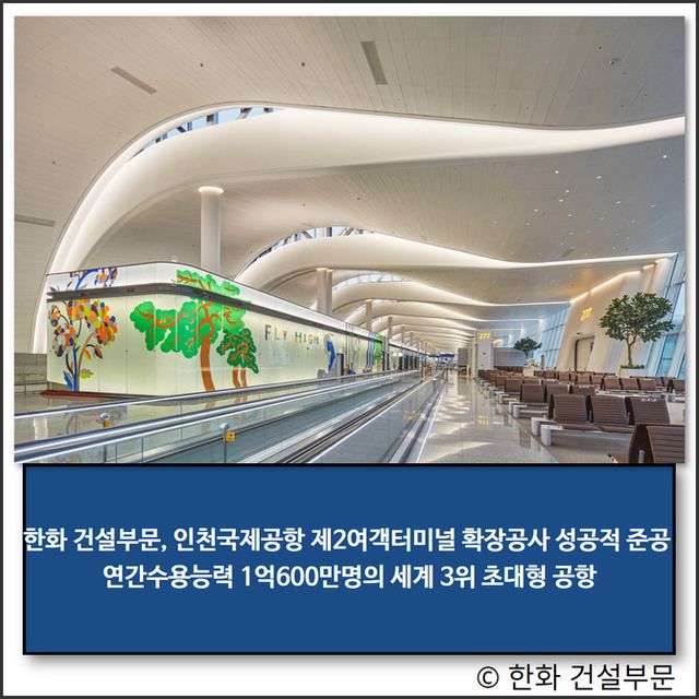 한화 건설부문은 지난 2020년 11월부터 2024년 10월까지 총 47개월간 인천국제공항 제2여객터미널의 동편 지하 2층부터 지상 5층까지 확장공사를 담당했다, 서편은 HJ중공업 컨소시엄이 담당했다. 인천국제공항의 건물 내부는 친환경 공간과 최신 ICT 기술이 함께 조화를 이뤄 최첨단 터미널로 완성됐다.