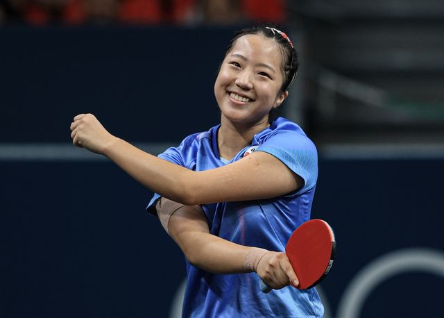 대한민국 탁구 대표팀 신유빈 선수가 지난 8월 1일 오전(한국 시각) 프랑스 파리 사우스 파리 아레나 4에서 열린 '2024 파리올림픽' 탁구 여자 단식 16강 미국의 릴리 장 선수와의 경기에서 승리한 후 미소를 짓고 있다. / 뉴스1