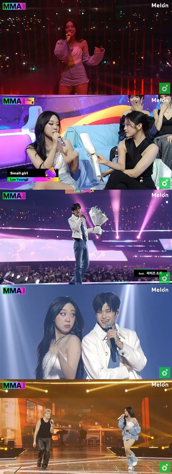 이영지는 가수들 사이를 지나다니며 꽃을 한 송이씩 수집했다. 투어스 신유와 에스파 카리나, 라이즈 성찬 등에게서 꽃을 한 송이씩 받은 이영지는 이어 꽃다발을 들고 등장한 라이즈 소희와 듀엣 무대를 꾸몄다. 잔망스러운 두 사람의 듀엣 호흡이 객석의 환호를 끌어냈다.