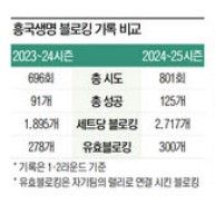 원래 뛰어났던 공격력보다도 지난 시즌과 비교해 크게 향상된 블로킹이 눈에 띈다. 흥국생명은 세트당 2.714개를 기록하며 이 부문 1위를 지켰다. 지난 시즌 정규리그에선 2.136개였다.