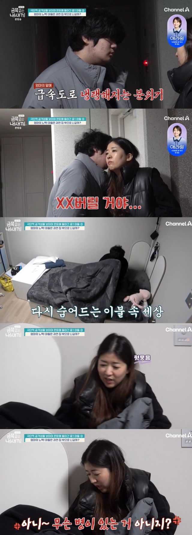 금쪽이는 다시 이불 속으로 직행했고, 곧바로 따라 들어온 엄마는 "산책하고 얼른 들어오자"고 회유하더니 "무슨 병이 있는 거 아니지?"라고 웃음을 터뜨리며 자극적인 말을 쏟아냈다.