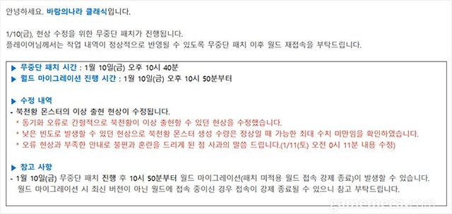 그런데 실제 플레이에서 패치 노트 내용과 달리 북천황이 여러 채널에 동시에 출현하는 현상이 포착됐고, 이에 대한 유저 제보도 이어졌다. 이러한 문제가 발생한 이유는 오류 때문이었다. 바람의나라 클래식 개발팀은 지난 10일 무중단 패치를 통해 동기화 오류로 북천황이 이상 출현하는 현상이 발생했고, 이를 수정했다고 밝혔다.